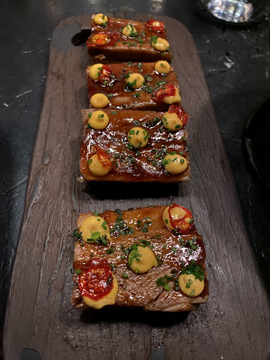 Read moreAté que ponto a expectativa influencia na experiência? Acho que bastante! E a minha era bem alta em relação ao Iz... E o resultado não foi o mesmo. O lugar é bonito, de uma simplicidade elegante, mas tão escuro que dá até sono. O atendimento é excelente... Os garçons são atenciosos e gentis. O cardápio tem uma variedade interessante... Dá vontade de provar tudo. Das entradas... Recomendo a barriga de porco. Bem equilibrada e temperada. Uma delícia. As colherinhas com camarões e banana também estavam gostosos. Um molhinho adocicado que casou bem. Pena que os camarões estavam um pouco fora de ponto (pra mais). O tartar de picanha já não surpreendeu tanto. Estava um pouco seco e faltou sabor. Já o "pastel" de atum encantou. A combinação inesperada da massa de pastel com o atum fresco, bem temperados com wasabi e especiarias foram uma agradável surpresa. A entrada mais triste foi a coxinha de espinafre com cordeiro. Pensei nessa combinação tão exótica e nunca antes vista e Salivei... O que veio foi uma coxinha massuda, com massa indistinguivel das comuns. O recheio de cordeiro sozinho estava incrível.. Mas se perdeu na massa. Ponto alto pro creme de wasabi. Delicioso. Os drinks estavam gostosos... Mas nada muito excepcional. O único que realmente não recomendo é uma espécie de "Moscou mule smoked"... O defumado rouba o sabor e deixa o drink desagradável. De principal, provei somente o polvo a la plancha... Ponto estava incrível e muito bem temperado. Porém os cereais tostados deixam o prato desequilibrado pela textura extremamente dura e desagradável. As sobremesas foram agradável surpresa. A ambrosia com manjericão me deixou de queixo caído. E o chocolate com caramelo tinha uma potência de sabor incrível! A experiência final foi boa... Só recomendo não ir com tão alta...
