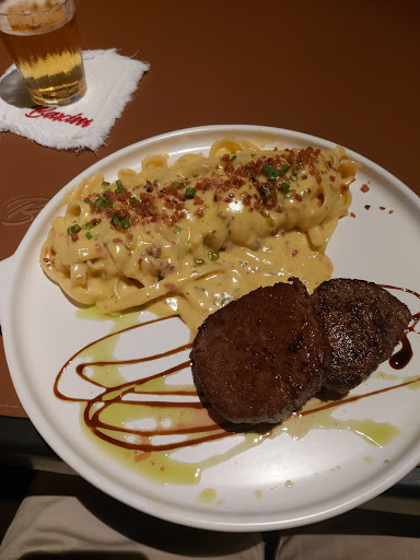 It seems everytime i eat somewhere different the food just gets better. I had a carbonara with a perfectly cooked delicious steak. Washed down with staten beer. What could be better? Oh yes, being with my fiance who had a prawn and rice something or other that she swooned over. The service was top notch and the restaurant was inviting and relaxed. A small kids area kept the children occupied and every now and they one would run back to their table to take a bite of dinner and a drink then run back as fast as their little legs could carry them in case they missed out on 39 seconds of fun. If in Goiania, this restaurant is...