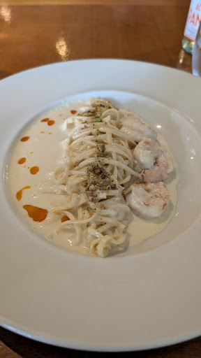 SERVIZIO OTTIMO con presentazione del responsabile di sala, attenzione e cura nel servizio di sommelier. Locale molto pulito e silenzioso cura nei dettagli del arredamento con richiami alla cultura italiana, senza essere eccessivo, tutto al posto giusto. Acqua panna in vetro ottima scelta. Carta dei vini sufficiente scelto vino bianco argentino Antipasto bruschetta di gambero gambero caldo ma pecca avrei tostato meglio il pane per aiutare ad amalgamere i sapori. Nonostante questo non ho lasciato nulla nel piatto ottima la scelta di abbinamento di formaggio pomodoro fresco salsa di basilico e gamberi. Primo piatto unico Gamberi limone e pistacchio il piatto è accompagnato da una pasta fresca e come accade sempre all'estero portano sempre un cucchiaio per mangiare la pasta 😭 Il piatto alla vista risulta accattivante, la salsa risulta molto liquida ma il sapore gradevole la pasta un tagliolino fresco risulta cotto al dente e di quona qualità ma risulta mancante il sapore di pistacchio e limone superati dalla salsa alla panna peccato l'idea del piatto era ottima. Calibrando bene i sapori potrebbe essere un ottimo piatto.