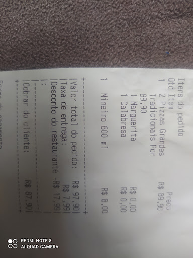 Read moreNÃO PEÇAM PIZZA NESTA LOJA!!!!!!! Ontem (25/12/22) fiz pedido de uma pizza neste local pelo aplicativo da 99, além do atraso de 1hr, quando finalizaram o pedido, a pizza não chegou na minha casa, tentei inúmeras vezes contato com a empresa e não obtive sucesso, e a entrega é total responsabilidade do estabelecimento assim estava informando no aplicativo. Uma falta de respeito você pagar por uma pizza e ela simplesmente não chegar na sua casa, você não ter retorno de nadaaaaaa, eu perdi 70,00 reais pois paguei no débito pode ser pouco pra eles mas pra mim era o que eu tinha ontem, nunca fui tão humilhada por um empresa. NÃO COMPREM, EU...