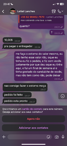 Informaram que não poderiam fazer a entrega, sendo que todas as vezes que pedi pelo Ifood, chegava em menos de 20 minutos, entre preparação e entrega. Vendo a péssima atitude e pouco caso no atendimento via WhatsApp, não recomendo esse lugar pois concluo que eles não precisam vender. R: Quando vcs considerarem que o cliente é quem paga as contas de vcs, talvez entenderam a reclamação, PÉSSIMO ATENDIMENTO SIM ! Questionar um um cliente dessa forma, é a mesma coisa que negar o fato ocorrido, tenham um pouco de decência e lêem o histórico...