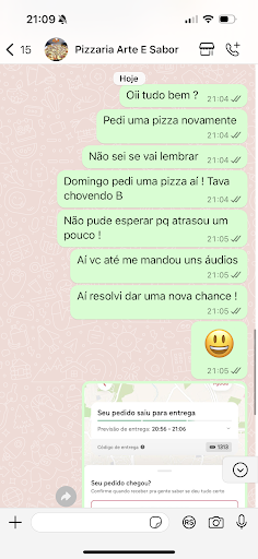 Read moreGostaria de compartilhar minha experiência com a Pizzaria Arte e Sabor. Tenho comprado com eles várias vezes e infelizmente, quase todas as vezes que fiz pedido, enfrentei algum problema.