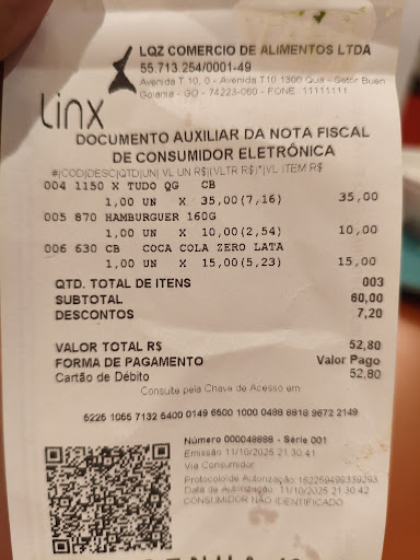 Read moreHoje, 11/10/2025, estiver no QG do Goiânia Shopping e pedi um combo de um sanduíche chamado "Xtudão", que de grande só tem o nome. O problema é que paguei por um hambúrguer de 160 gramas, o mais caro do cardápio, e me veio um hambúrguer de no máximo 100g, reclamei e até a atendente do balcão achou pequeno e questionou o chapeiro, que respondeu que era aquilo mesmo. Deixei pra lá porque não sou besta de mandar comida de volta para a cozinha pra colocarem alguma coisa nojenta no meu pedido. (Infelizmente quando tive a ideia de avaliar e alertar as pessoas, já tinha comido o sanduíche, por isso não tirei foto, mas juntei a foto do cupom fiscal) Me senti enganado com tamanha desonestidade desse estabelecimento, que deve praticar essa conduta, não só comigo, mas lesa a todos os consumidores. Aqui eu...