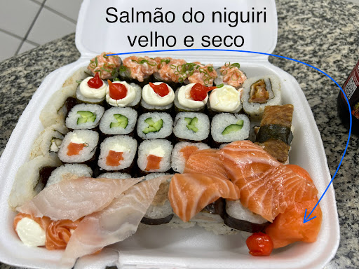 Os salmões dos Niguiris, alguns estavam pretos, dando sinais de que eram nada frescos.