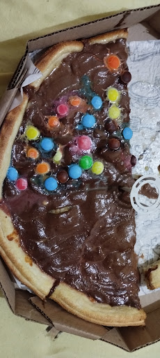 Motoqueiro se perdeu e não se atentou ao endereço. Não parecia ser massa de pizza. Cheiro de fermento forte. Massa parece ser pronta já... Só está pela metade porque meu namorado come qualquer coisa sem reclamar. Tive muita expectativas de uma coisa gostosa. Ainda veio com sabor do recheio errado. Pedi chocolate com banana e metade de confete. Veio "chocolate com banana" é confete junto na mesma pizza.