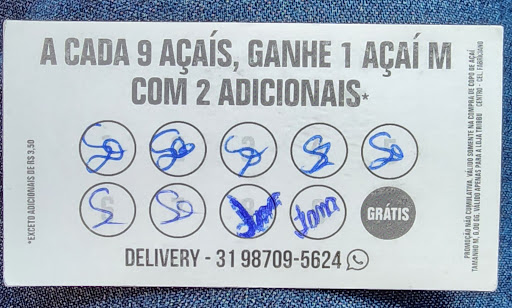 Read moreQuero informar aos clientes fieis deste estabelecimento que aquele cartão de fidelidade não funciona mais. Infelizmente a empresa não colocou aviso anunciando, tão pouco prazo para encerrar a promoção de fidelidade, assim, pra não ter CONSTRANGIMENTO na hora de entregar o cartão fidelidade completo e receber um NÃO terá direito a um açaíde graça, aqui está a informação. Não recomendo esta empresa. Não respeita o...