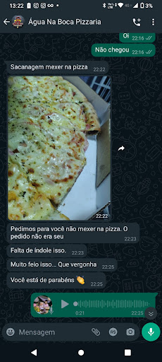Tréplica da mensagem abaixo recebida pela empresa : pode se ver que em nenhum momento a empresa tem humildade de reconhecer o correto, continuo afirmando que não foi assim que aconteceu, esse motoboy está distorcendo a situação, e essa empresa está sendo arrogante em relação ao acontecido, espero que as pessoas vejam como eles lidam com as situações. eu não faltei educação com o motoboy, apenas reagi quando ele me chamou de louca por mexer na pizza, e não falei que iam entregar a pizza que foi para o lixo depois de mexer e sim antes quando falaram que não era para mexer, vem falar de educação dos meu filhos e eu estou bem disposta a ver quem é a errada dessa história… aguardem pois mesmo a pizza não sendo minha estava na minha casa, foi aberta e vcs queriam levar para outro cliente se não fosse mexida. Volto a repetir eu ia pagar pela pizza que foi mexida! Bem se vê pq os funcionários são assim, se o próprio dono trata os cliente...