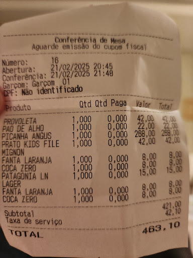 Read moreQuisimos probar algo distinto para salir de la oferta típica del destino playero brasilero y el lugar quedaba convenientemente cerca del hotel. Prometía ser algo bueno por la recepción de la dueña (posadeña que no nos dio el nombre), pero los precios inflados que no fueron respaldados por la comida (regular y escasa) más la mala atención de sus aprendices de mozos, convierten a Angus en un Steakhouse muy pretencioso tratándose de una carta con precios de gran restaurante servidos en el patio de una casa alquilada. Si estas en Canto Grande y te tienta, SEGUI DE LARGO! Casi 500 reales para 3 personas, por lo que sirvieron, es una estafa! Lo positivo (y las dos estrellas) fueron: El pan de ajo y la provoleta....