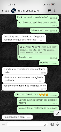 Read moreNão sou de reclamar mas nesse caso não vi outra solução, tentei resolver com o restaurante que fez pouco caso, eles acham que não estou na minha razão de reclamar de um sushi HORRÍVEL extremamente caro com 0 qualidade, estou completamente insatisfeita com o pedido e com o pouco caso do restaurante, meu pedido foi no valor de 342,00 onde só consumi o risoto de 89,00 pois os sushis estavam horriveis, não estavam frescos, gosto extremamente forte, encheram de óleo por cima para disfarçar, os hots não tinham gosto de hot, não sei nem descrever de tão horrível, entrei em contato com o restaurante para resolver e eles acham que não tenho direito de reclamar, isso é um absurdo! Enviei fotos pra eles que apenas provamos ainda reclamaram de nós termos provado, tentei resolver de todas as maneiras, pedi até mesmo para buscarem o pedido e nada foi feito, resumindo joguei tudo no lixo e perdi...