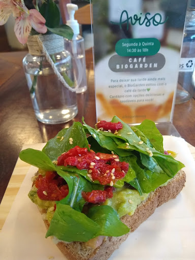 Read moreNão sou vegetariana nem vegana e sou simplesmente apaixonada pelo BioGarden. Ao meio dia, o buffet é variado e cheio de sabores. Tive a oportunidade de experimentar uma culinária diferente, opções que eu nem sabia que existia, quebrei diversos pré conceitos e sou frequentadora do restaurante. Mas não é só ao meio-dia, à tarde eles têm disponível um belo espaço para café. Com bolos saudáveis, salgados prontos além de opções do cardápio como essa brusqueta que está na foto. Tudo com muito capricho e produtos de qualidade. O amplo estacionamento também é um diferencial por estar no centro da cidade. Sucesso...