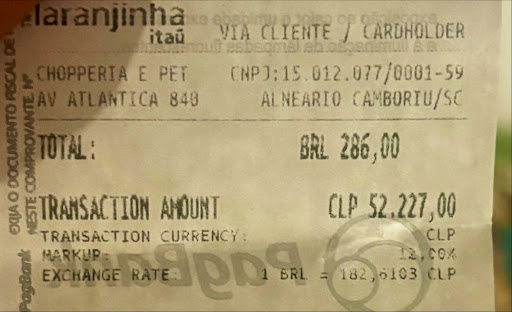 OJO ! Al pagar. No usar tarjeta de crédito… durante todo el día ( y la semana ) mi tarjeta me realizó el cambio de 1 real = 167 pesos chilenos ….. NO SE PORQUE solo en este local , el cambio fue 1 real = 182 pesos chilenos! Al poner la tarjeta el atendedor apretó todo muy rápido no vi que cambio se eligió ni nada solo lo vi aguando me entregó el papel del pago ya realizado ! Revise en mi banco y fue la única compra con ese cambio más alto! Todas las demás compras del día fueron al mismo cambio …. Me parece muy extraño! No sé si ellos cobrarán alguna comisión por pagar con tarjeta de crédito o algo pero por favor revisen bien!