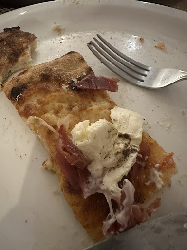 Read morePela primeira vez na minha vida pedi uma pizza família (ou gigante) para 3 pessoas e saí do restaurante com fome. Uma das pizzas mais esquisitas que já comi, e isso que pedimos os sabores mais caros de todos. Embora a massa seja boa e leve, a pizza é extremamente mal distribuída e parece que foi requentada; pouquíssimo recheio e praticamente nada de queijo. Uma tristeza do início ao fim, principalmente por perceber que parece que estão economizando no recheio e preparo. Por incrível que pareça, a menos pior foi a doce. Pra ser ok precisa melhorar muito no processo de produção. De qualquer forma, jamais voltarei para uma segunda vez. Na foto, um pedaço de uma pizza de tomate (simplesmente cortam e jogam o tomate cru em cima, sem sal, sem cuidado, sem nada) com presunto cru e burrata sem nada de queijo por...