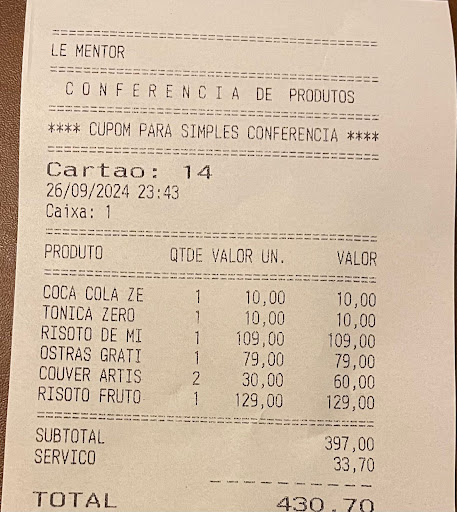 Read moreInfelizmente depois de várias vezes ter ido neste local com meu esposo também com amigos, não tenho que reclamar das comidas ou dos drinks, que são excelentes, mas infelizmente no resto deixa a desejar. Quando ia antes com marido e amigos nunca tinham questionado, a conta como sempre bem salgada, mas nós pagávamos sem questionar e tudo bem! Mas desta vez fui com minha filha de 13 anos, que em realidade estava desejando terminar logo a comida é meu drink pra irmos à casa, então pedi a conta, fui verificar então dei conta que eles tinha cobrado o couvert artístico das 2, como se não foi pouco ainda cobraram os 10% em cima dó couvert 😳completamente abusivos, vergonhoso enganar as pessoas desta forma. Quando fui reclamar o couvert artístico da minha filha de 13 anos, a moça que fica recebendo os clientes, falou que tinha uma lei que obrigavam crianças partir dos 10 anos a pagar. Será que vcs não tem vergonha na cara de soltar uma tamanha de uma mentira 🤥 dessa! Que pena um local que vamos pra distrair, comer uma bis comida, tomar um coquetel, se transforma em uma saída indesejável. Por favor não se der o trabalho de responder minha mensagem com seu robô automático! Já li todos comentários, o respeito de vcs al cliente e 0,...