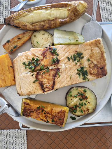 Mediano. O ambiente é bonito com ambiente rústico. Pedimos salmão ao molho branco , pedi ele mais mal passado e veio frio por dentro como se fosse selado ainda congelado e ficou cru e gelado e ransoso. .... Minha sugestão é usar peixe fresco mesmo que aumente o preço. Os acompanhamentos poderiam mudar, mt ruins e simples para acompanhar o salmão( Batata doce, cenoura assada, Chuchu e abobora) sofrível. Arroz ok Trouxeram um couver sem pedirmos e cobraram uma taxa que achei constrangedor e deselegante( caldinho de Feijão e um ceviche c torradas . Pedimos suco de melancia que adoçaram e está impossível tomar.