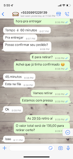 Aceitei o tempo de 45 minutos como prometido pela atendente (olha a conversa do WhatsApp). Mas, meu marido chegou em casa (meu endereço fica a menos de 5 minutos de carro) era 21:25 ou seja 30 minutos após o tempo prometido. Recebi meu pedido mais de 1 horas após entrar na fila. Eu não importo em esperar se a pessoa quem está atendendo for realmente honesta e falar o tempo de espera certo. É simples, fala que o tempo de espera é de 1 hora e meia, 2 horas, mas para não “perder” o cliente prometem uma coisa que não cumprem…super chato e frustrante isso!!!
