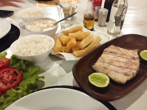 Os pratos são bem servidos, para matar a fome até de quem gosta de comer muito. Pedimos robalo na brasa e camarão ao molho branco, além da macaxeira.