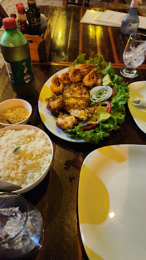 Un poco alejado de la plazoleta de la iglesia ( 7 minutos) pero vale la pena. Ambiente simples pero buena comida ( picadas) . Recomiendo la Langosta ( excelente). Tuvimos la suerte de ir en una noche de sábado com música en vivo ( forró ).