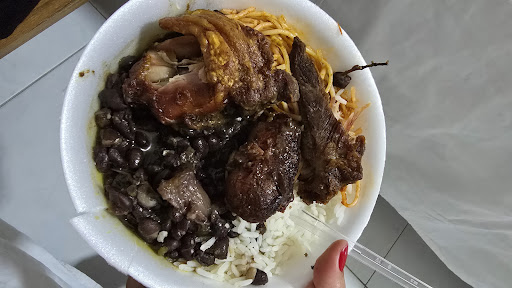 Péssimo! A comida é horrível. Pedimos uma comida com salada, feijão de caldo e sem linguiça. Veio: uma feijoada VELHA, fedendo e fria, um macarrão azedo, uma linguiça queimada, carne ruim, e sem salada nenhuma. Com duas crianças aqui pra comer essa comida, demorou 30 minutos pra escolher a dedo essas coisas ruins, são quase 22 hrs e todo mundo vai ficar com fome por conta disso. Ahhh e ainda veio esse pedaço e...