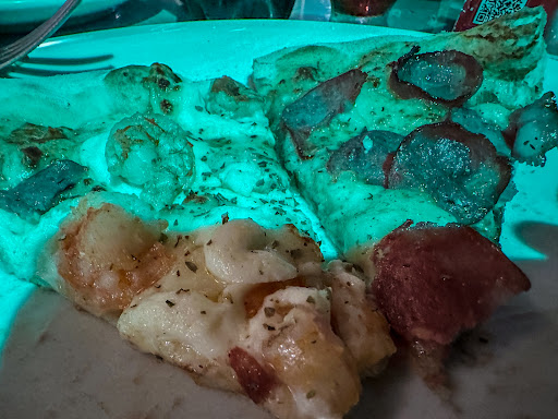 A pizza é boa. Tem ingredientes bem combinados. Mas ficou fria por conta da combinação de ar condicionado super forte + ventilado. Pedi suco de caju para acompanhar. Veio uma jarra de 2L. Como só tinha eu e meu namorado para tomar. Então acaboi sobrando, o que não acho legal. A dose de suco poderia ser menor e a pessoa pediria mais se fosse o caso. Odeio desperdicio de comida. Sem falar que o suco estava extremamente doce, o que deixava enjoativo e dava menos vontade de tomar.