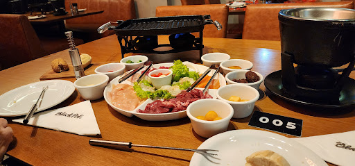 Read moreQueria só poder tecer elogios, mas, desta vez, não deu. Nos stories não haveria espaço para esta sequência... de falhas e não de fondues. Amo a especialidade suíça, mas o que foi servido no @blackpotrestaurant de Joinville decepcionou. O lugar é lindo, os garçons cordiais, o saxofonista é bom, mas... A carne do rodízio original estava extremamente dura. Não conseguíamos mastigá-la. Quando reclamamos, a funcionária Letícia (que nos informou que o gerente não estava presente) nos disse que não adiantava trocar a carne, porque o problema era do fornecedor, então certamente viria outra carne igual. COMO ASSIM? a sequência custava 139 reais. No dia anterior fui ao rodízio de grelhados do vizinho @giusepperestaurante e todas as carnes, alcatra, entrecote... estavam macias.... A carne do @blackpotrestaurant , mesmo cortada como uma lâmina e não em cubos, estava uma pedra, Braseeel. A funcionária Letícia ainda sugeriu trocar por outros acompanhamentos SEM CARNE bovina, sendo que, antes, tínhamos pedido se podíamos trocar todos por apenas carne bovina e não nos tinha sido permitido. Por fim, vieram com um potinho de carne, do tamanho daquelas pequenas cerâmicas de molho, com uma carne menos pior, mas ainda dura. O fondue de carne não tem os tradicionais molhinhos em pasta, que costuma-se vir nas cerâmicas. São galheteiros, como esses de vinagre, com óleos saborizados. E só trouxeram porque eu pedi. Mas, de verdade, não era molho. O fondue de chocolate veio à mesa frio. E, obviamente, a chama do rechaud não foi suficiente para esquentá-lo. Todos os sucos servidos são industrializados, como esses de caixinha ou de garrafa. Nem o suco de laranja é da fruta mesmo. Como o de laranja era bem ruim, pedimos pra trocar pelo de uva. Trocaram... por um copo com.a metade da capacidade. Uma economia mesquinha. Ah... e demorou um século. Pedimos o rodízio promocional de raclete. Esse, depois de eu reclamar da demora pra vir, passou a ser constante e estava bom. Enfim, foi uma experiência ruim, éramos 7 pessoas em duas mesas, a conta não saiu barata e fiquei envergonhada frente ao casal de amigos que nunca tinha...