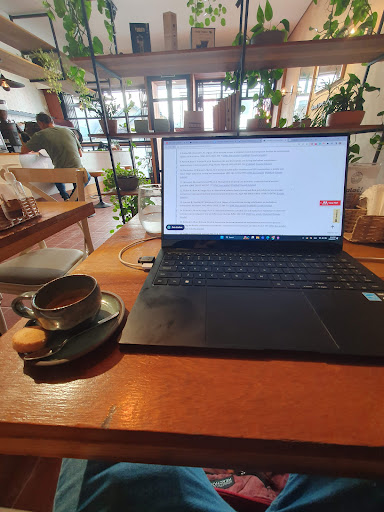 O ambiente é gostoso, tem tomada e dá pra trabalhar. Só um pouco apertado pra passar entre as mesas.