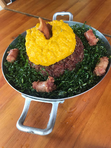 Fomos conhecer o Cabra da Peste, sempre falado e muito indicado por todos em Ibitipoca. A casa possui mesas ao ar livre, 1 andar e no segundo andar que é muito bonito e decorado. A Larissa nos atendeu muito bem, educada e solicita. Escolhemos de entradinha o “Dadinho de Tapioca” que estavam uma delícia, de bebida para experimentar o “Refri Natural do Cabra - xarope de gengibre, limão e água com gás” que é muito gostoso. Para comermos escolhemos o “Do sertão - baião de dois (arroz, feijão fradinho, bacon, queijo coalho) + 400g de carne de sol (produzida por nós) e grelhada na manteiga de garrafa sobre creme de macaxeira, no cardápio está que servem duas pessoas, porém, três pessoas comem tranquilamente, é um prato muito saboroso, a carne estava sensacional e o creme muito cremoso. Vale ressaltar que a pimenta deles é muito forte, mas saborosa pra quem gosta! Vale muito a pena conhecerem o Cabra da Peste...