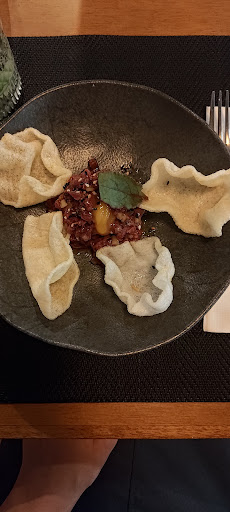 Sobre o menu, peguei o três passos para conhecer por ser a primeira vez que havia ido ao restaurante. Pedi dois drinks os quais estavam muito bons! Excelente! Entrada estava muito boa, bem apimentada para alguns paladares. O prato principal a decepção começou, o risoto de camarão apesar de bastante camarões os mesmos não estavam limpos, ao questionar o garçom por instrução do chefe disse que é assim mesmo, pois eles eram pequenos não dava para limpar e que faziam uma bisque com as aparas então que era normal... Me ofereceram trocar o prato pela opção com carne, mas eu não quis. Sobremesa pedi o cheese cake, o qual, muito bonito, bem apresentando mas bem sem graça, provavelmente em uma padaria de bairro se encontra melhor.