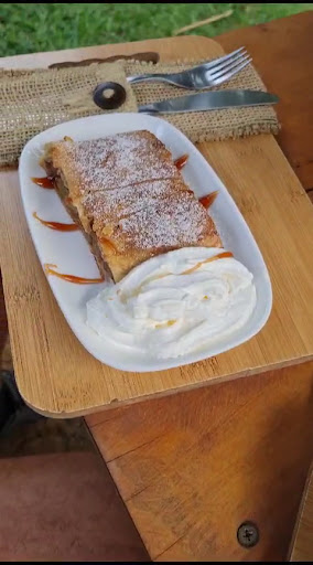 Local é muito aconchegante. Vale a pena. Muitas delícias para experimentar. Bom Apfelstrudel. Uma sobremesa tradicional austríaca, nascida em Viena, tendo-se tornado popular internacionalmente. É a receita mais conhecida com a massa folhada da Europa central, conhecida em Alemão por Strudel (redemoinho). Pensa-se que tenha sido influenciada pelas cozinhas do Império Bizantino, da Arménia e da Turquia. A arte da preparação consiste em fazer uma massa muito fina e elástica. Diz-se que cada camada deve ser suficientemente fina para se conseguir ler um jornal através dela. A tradição sugere que seja servido ainda quente, com açúcar a gosto, apesar do gelado de baunilha e do chantili serem bastante populares. Outra forma agradável de comer consiste em regá-lo com molho de baunilha, conhecido por...