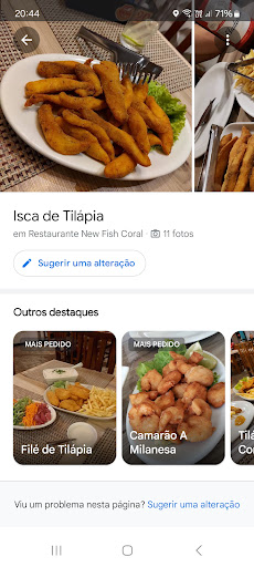Read moreSobre o New Fish do shopping: Depois de 1 hora esperando, o pedido que fiz veio com uma batata frita gelada, a tilápia que parecia feita só de pele de tão seca que estava, um camarão borrachudo frito em óleo velho e o frango, morno, que claramente também demorou para ser servido. Reclamei para a mulher que estava atendendo, que não pareceu se importar muito, até sugeriu aquecer o prato, mas como poderiam aquecer um prato com fritura? Já comi outras vezes nesse restaurante e estava muito bom, porém não está mais, a qualidade precisa melhorar muito pra ficar ruim....
