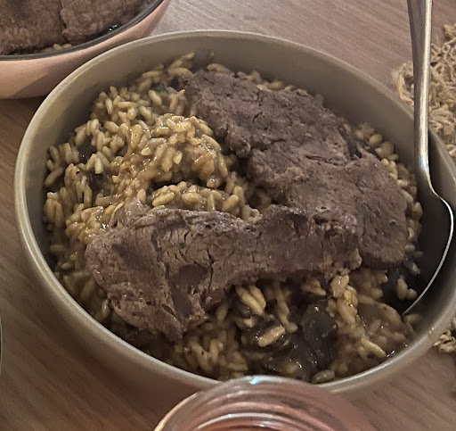 O corte apresentado nos pratos era duro, com nervos aparentes, o que não condiz com as características do filé mignon, uma carne reconhecida por sua maciez e ausência de nervuras. A procedência da carne servida não corresponde ao que foi anunciado, e isso é visível nas imagens que registramos, onde claramente se veem bifes comuns sobre o risoto, e não medalhões.