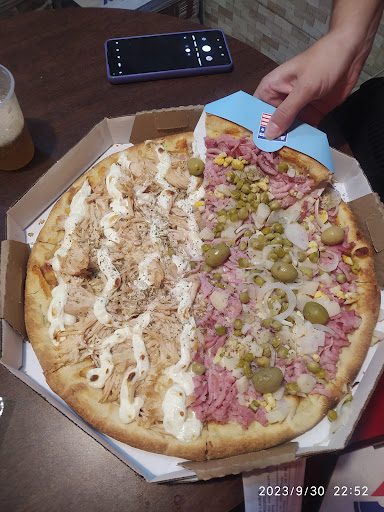 Read moreAs pizzas em geral são saborosas, exceto as clássicas, que muitas vezes deixam a desejar. São exatamente as mais baratas. O restante têm um preço médio pra alto. Típica pizza brasileira com massa grossa e ingredientes em pedaços grandes. A franquia usa um tipo de papel em um formato que se encaixa na mão e no pedaço da pizza. Não é recomendado a quem vai pensando que vai ser servido com um prato, garfo, faca, azeite e etc. Os prós do estabelecimento ficam por conta da excelente localização na cidade, ambiente agradável e bonito com três televisões distribuídas, conforto pela maioria dos bancos serem almofadados, além da facilidade em realizar o pedido e a rapidez em servir os clientes, mesmo quando é pizza meio a meio, com dois...