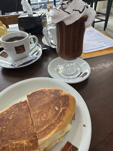 Custo benefício bom! Gosto mto do pão caseiro na chapa com queijo branco e peito de peru. O capuccino deles é top, já o chocolate quente parece toddy, não recomendo. da última vez tomei um com café expresso, cholocate 70% e chantilly (da foto), gostei bastante. O pão de queijo é melhor quando acaba de sair, depois fica duro parece um biscoito de polvilho. Também já comi um croissant que é enorme e gostoso, mas a massa não é folhada e sim igual um pão. Os bolos estão caindo na qualidade, a primeira vez que comi amei, depois percebi que a massa está seca, apenas do recheio ser generoso. O preço do bolo também é ótimo 16 reais a fatia. O único que continua bom é...