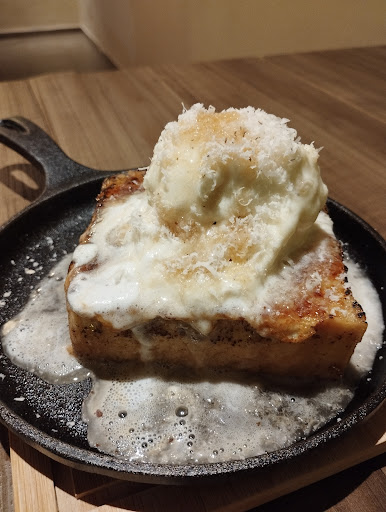 A sobremesa que pedi era sugestão do chef, rabanada com sorvete de cumaru e calda de caramelo salgado, que levou mais 30min pra chegar e era bem doce, o açúcar ficou cristalizado em cima do pão e a fatia de pão é bem grande, dá pra duas pessoas que gostam muito de doce comerem tranquilamente. Gostaria de ter sido avisada sobre o tamanho da sobremesa pois foi muito pra mim.