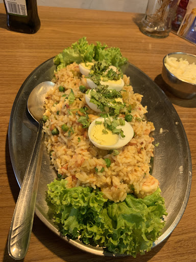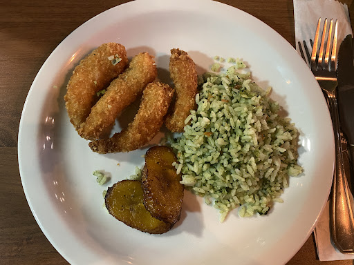 Como eu não como presunto, ela foi super proativa e nos sugeriu de trocar o arroz à grega por arroz com brócolis. Logo, nós comemos o camarão empanado com arroz à grega (substituído pelo brócolis) e a banana da terra. O camarão estava fresco e bastante crocante.