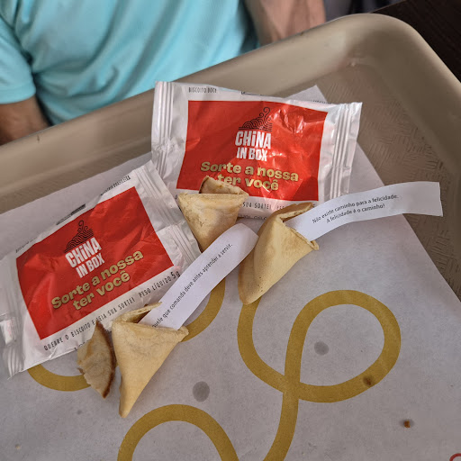 Read moreJantarzinho rápido com a família, fazia tempo que não comíamos China in box e fomos até lá, pedimos para comer no local. Local simples mas agradável, climatizado e com brinquedo para criança. Pedimos 01 executivo de frango à passarinho, 01 executivo de carne acebolada, 02 rolinhos primavera, 01 bolinho no vapor com camarão. O sabor do China in box sempre foi o mesmo, desde sempre, não sei o que houve com a franquia mas perderam o padrão... o frango estava ressecado, a carne acebolada não estava saborosa, a carne em pedaços grandes e duros, o arroz não estava saboroso, como se os vegetais tivessem sido colocados depois do arroz pronto, os vegetais cortados em pedaços grandes tbm...Os rolinhos primavera estavam encharcados de óleo e bem escuros, ou queimaram ou o óleo estava velho, até o molho agridoce que pedi não estava bom...Realmente a única coisa que estava igual ao China in box de antigamente foram os biscoitos da sorte......