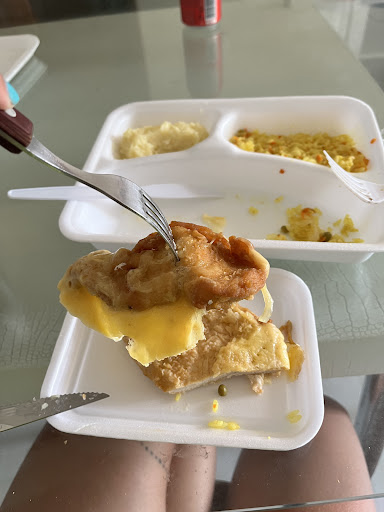 Read moreMinha experiência foi péssima! Fiz um pedido de 2 pratos pelo ifood que atrasou mais de 1 hora e quando chegou estava frio e ainda veio faltando 1 dos pratos. Esse da foto era pra ser um filé de frango a parmegiana que de parmegiana nao tinha nada. Apenas um frango seco com queijo supostamente derretido que endureceu. O pedido estava pronto à 1 hora antes do entregador buscar! Nem pra refazerem o pedido! Assim que chegou tentei contato pelo ifood, pelo whatsapp e pelo telefone e simplesmente NINGUÉM pra responder! Total descaso...