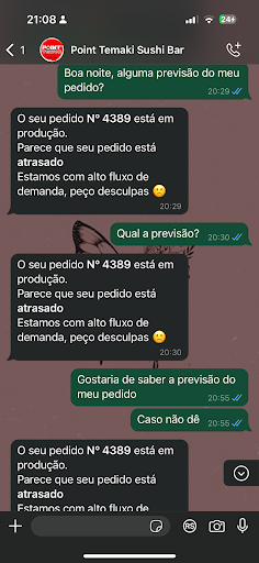 Venho aqui deixar o meu descontentamento. Sempre pedi sushi deste local e, mesmo com a demora, chegava gostoso. De uns tempos pra cá está sendo só ladeira a baixo. 1° programa fidelidade que nunca aumenta os pontos 2° demora dos penúltimos pedidos e sem tare caseiro extra que pedi. 3° o último que veio apenas UM molho tare (pedi 4 extras que veio) então se eu não pedisse os molhos extras iria vir apenas UM molho tare? O pedido foi quase 70 reais para vir apenas um molho tare? Pra completar veio a pele do peixe por cima do sushi e pele como recheio dos hots com o gosto horrível. Meu dinheiro não é capim pra ser tão mau usado assim. E a cereja do bolo foi uma diarreia das brabas que tive depois do consumo. Sempre pedi desse local, era gostoso mas agora tá horrível. Perderam uma cliente assídua....