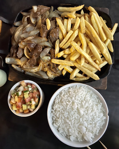 Além disso, recomendo pedir a porção de alcatra acebolada com batata ($50+-). Acompanha arroz e vinagrete. Serve até 3 adultos.