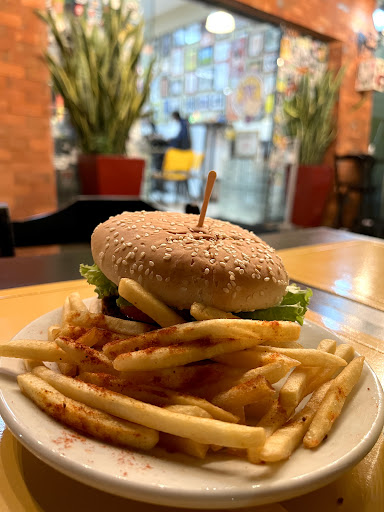 Pedimos o hambúrguer X-Salada ($29) e o baguete Super Lola ($35), que acompanham batata e anéis de cebola, respectivamente. O suco de abacaxi cai muito bem ($10).