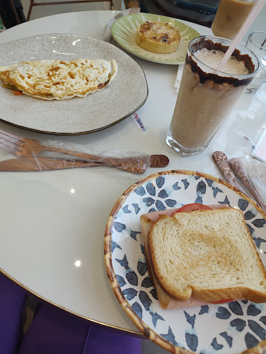 Pedimos : omelete com legumes (cenoura, abobrinha e alho poró), bauru , quiche de bacon e alho poró (eu acho) , eu pedi um capuccino gelado e não lembro o que meu marido pediu