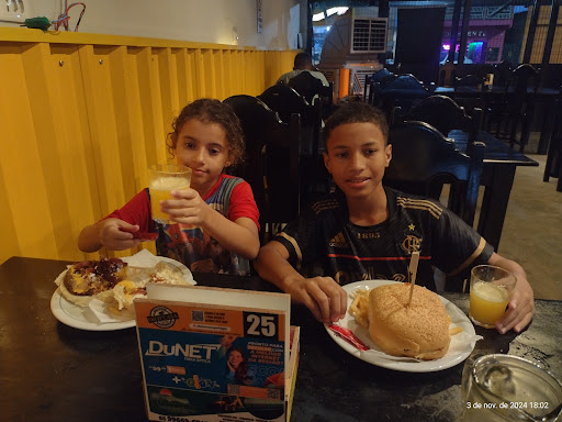 No presencial: o ambiente é arejado por bons ventiladores; o banheiro limpo e com papel higiênico disponível; tinha parquinho, música sertaneja em volume razoável e umas 2 ou 3 telas de TV passando coisas diferentes com volume bem baixo; cerveja gelada a garçonete disse que a porção de filé mignon que pedimos (assada demais) tinha 500g mas depois vi no cardápio que tinha 400g no burguer, disseram "maionese especial" mas era uma maionese bem comum, a carne estava assada demais e o pão podia ter sido selado na manteiga; as mesas de madeira (pintadas de preto) não tinham toalha e nem aquelas "bolachas de chopp", então o suor dos copos escorria pela mesa e melecava nosso braço.