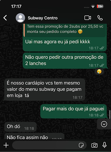 Read moreNunca fui tão mau tratada em uma franquia subway. A atendente do caixa é de uma antipatia imensa, comprei um refrigerante de 300ml e ela me deu o copo, apertei o botão do refrigerante pra encher o copo, mas ficou na metade entao apertei de novo pra terminar de encher, como ficou muita espuma eu iria apertar a teceira vez pra terminar de encher o copp e ela nao aceitou. Se eu paguei por 300ml de refrigerante, eu deveria consumir 300ml .... Mas ela não deixou. Só não dou nota 0 pq não pode, então eu...