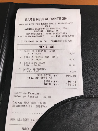 Read moreEu conheço o restaurante 294 há pelo menos 15 anos e sempre recomendei e elogiei os pratos e o atendimento do local. No entanto, minha última experiência no restaurante, foi no mínimo decepcionante. Ao pedir uma carne de sol na nata como prato principal, me foi entregue um prato com “pedaços” de carne quase queimada e com um caldo que não era nada semelhante à nata. Ao questionar se realmente aquilo correspondia ao que foi solicitado, o garçom sugeriu que pedíssemos para trocar o prato e o cancelamento deste. Optamos, então, por pedir uma nova carne de sol na nata . Essa, por sua vez, nos foi entregue completamente mal passada e com um caldo branco que não era nata e sim um leite extremamente gorduroso. Posso dizer que apenas o atendimento do principal garçom foi adequado para o ambiente e os valores que estavam sendo cobrados. Apesar das lembranças positivas que tenho nesse restaurante, depois disso, não o frequentarei e nem o recomendarei...