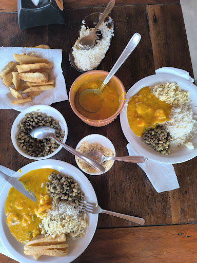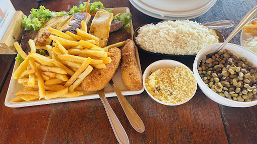No entanto, eu trocaria a farofa por salada, pois o prato já vem com três acompanhamentos de carboidrato (arroz, aipim frito e farofa), o que o torna um pouco pesado, considerando que o bobó já é feito com aipim.