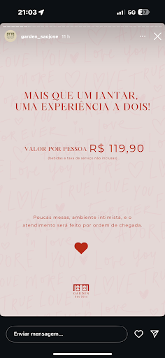 Péssima experiência no Garden São José no Dia dos Namorados. O restaurante anunciou no Instagram um menu especial para a data, informando que não trabalharia com reservas, apenas por ordem de chegada. Cheguei cedo, por volta das 18h30, para garantir lugar, e ao entrar, me deparei com 12 mesas reservadas. Questionei a funcionária, que explicou que decidiram abrir para reservas e entraram em contato apenas com as 12 primeiras pessoas que falaram com eles. Ou seja, descumpriram o que divulgaram publicamente e favoreceram quem teve contato direto, sem transparência com os demais clientes.