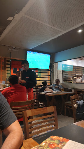 Read moreCardápio 144 opções salgadas. Há quem goste, mas pra mim isso é um excesso. Se quer inovar eu prefiro um cardápio onde escolho meus 3 ou 4 ingredientes preferidos e ele indica as Pizzas com os mesmos. Preços altos. Tem pizza de mais de $140,00. Apesar da boa qualidade, encontro Pizzas tão boas quanto a preços menores. Ambiente barulhento - a acústica não é boa, ambiente é estreito e comprido, muita gente falando, TVs ligadas, enfim, não é o local para ir bater papo. E às 19:30 já havia filas no sábado. Inconveniente porque você comer com a sensação de alguém aguardando, pra mim, incomoda. Obras na rua (julho/2023), um incômodo adicional pra uma rua que já é muito chata de estacionar. Espero que as obras melhorem isso. A pizza gigante tem 39cm de diâmetro. Bobagem contar em fatias pois basta afinar a fatia pra dobrar a quantidade. O que importa é o diâmetro da pizza. Outra coisa, se pedir borda vai perder recheio da pizza, pois não na da pra botar recheio sobre a borda alta. E a pizza não cresce se pedir borda. Por fim, pedi 1/2 pesto com funghi e 1/2 quatro queijos ($ 94,00). Meio a meio, gigante, com borda de chocolate (já era a sobremesa) e comemos em 4 pessoas, sem muita fome, nos atendeu bem. Ao final o preço ficou legal. Suco de laranja copo a $7,00...