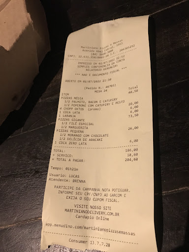 Depois de três anos voltamos pra reavaliar a pizzaria: (1) O ambiente - ampliou, mas precisa melhorar o ruído na parte da frente. A parte de dentro é mais silenciosa (recomendo) embora seja mais rústica. (2) O atendimento - muito bom, gentil e atencioso. Sorriso era constante e notei um genuíno desejo de nos agradar. (3) A pizza: pedimos 2 pizzas e 4 sabores. Massa bem fina, ingredientes de qualidade. Gostamos muito da de filé especial e da pepperoni catupiry e pesto. Já a margherita estava muito ruim, sem sabor e sem queijo. (Veja a foto da conta com as pizzas que pedimos). Depois pedimos 1 pizza 2 sabores doces (chocolate com morango e delícia de abacaxi). A primeira excelente como sobremesa, já a segunda não aguentei de tão doce. A combinação de açúcares me pareceu excessiva. (4) Estacionamento é o ponto fraco do local. Mas vc pode estacionar na rua e sugiro que o faça no lado oposto (outro lado do canteiro), pois em frente a pizzaria não tem vagas. (5) Preços - padrão de Natal das boas pizzarias. Eu diria que o preço é justo pelo que entrega, com exceção da pizza margherita que por ser uma pizza simples requer temperos e cuidados com a qualidade e quantidade de queijo que as outras não precisam. Para dois casais pagamos $51 por pessoa (conta de $204 com os 10%)