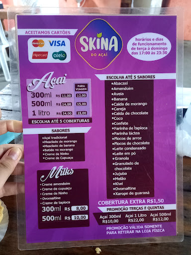 Read moreA última vez que provei o açaí da Skina do Açaí havia diversas opções e uma delas era bem mais parecida com o original e superou minhas expectativas. Além disso, é um lugar que aceita cartão e tem um ótimo atendimento. Então se você deseja apreciar essa sobremesa que vem ganhando mais adeptos recomendo conhecer...