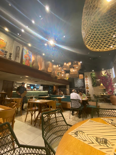 Read morerestaurante lindo, desde os bancos a decoração no teto, os pratos e até os bancos coloridos que deixam o ambiente mais charmoso