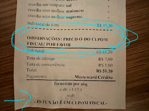 Read moreFui na loja compra um lanche, comprei dois de 15cm, onde um saia por 29 e levava o outro por mais 20, e um refri de 8, até aí tudo bem. O problema foi na fatura do meu cartão, quando percebi q fizeram ajuste no preço da minha compra saindo do valor de 57 pra 114. Aliás n isso seria fralde. Estou me sentindo completamente...